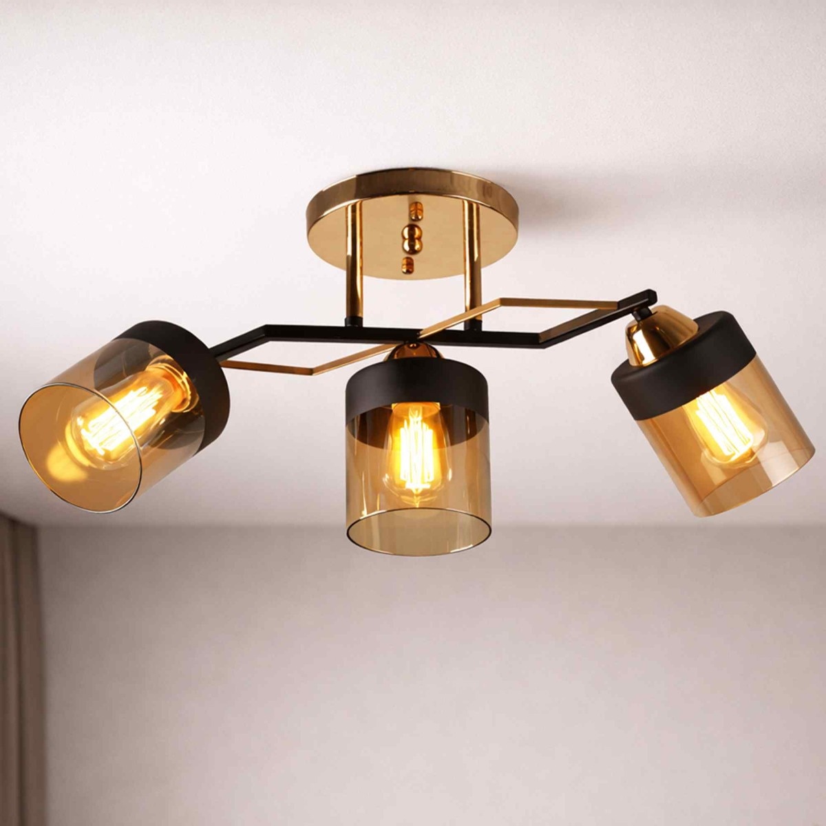 Lustra Klausen Laser LY-3483, metal negru + auriu, abajur sticlă ambra, 3 surse E27