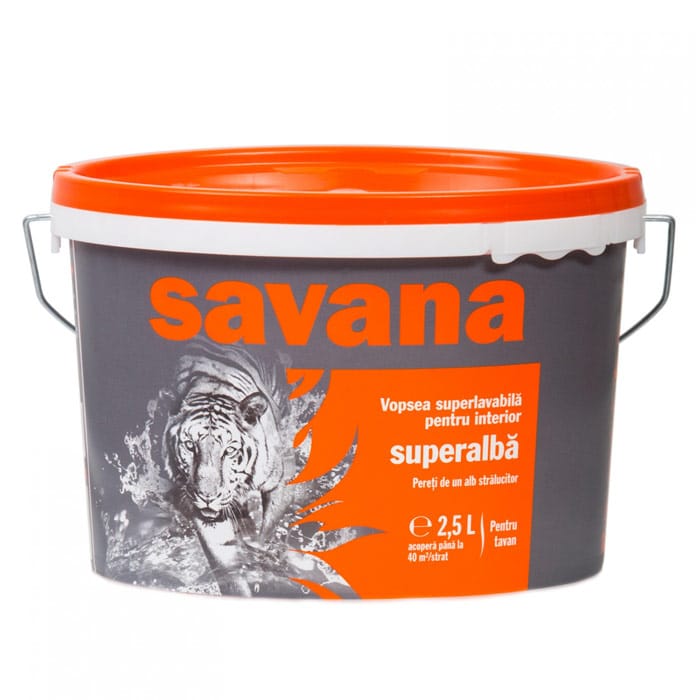 - Savana 2.5 L este o vopsea superlavabila pentru interior pe baza de copolimeri acrilici in dispersie apoasa, pigmenti, extenderi si aditivi. Prezinta aplicabilitate excelenta, putere de acoperire ridicata si aderenta buna la suportul pregatit corespunzator. Realizeaza pelicule cu grad de alb ridicat, superlavabile si permeabile la vapori.